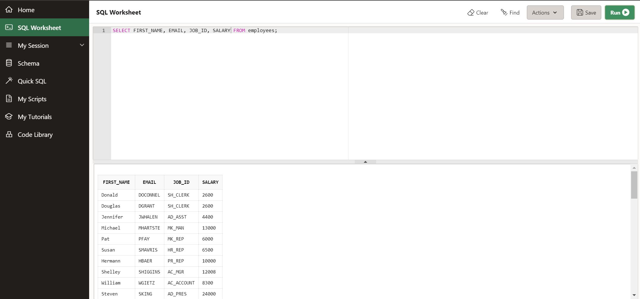 불러올 사람의 성, 이메일, JOB_ID, 연봉정보를 가져와보자