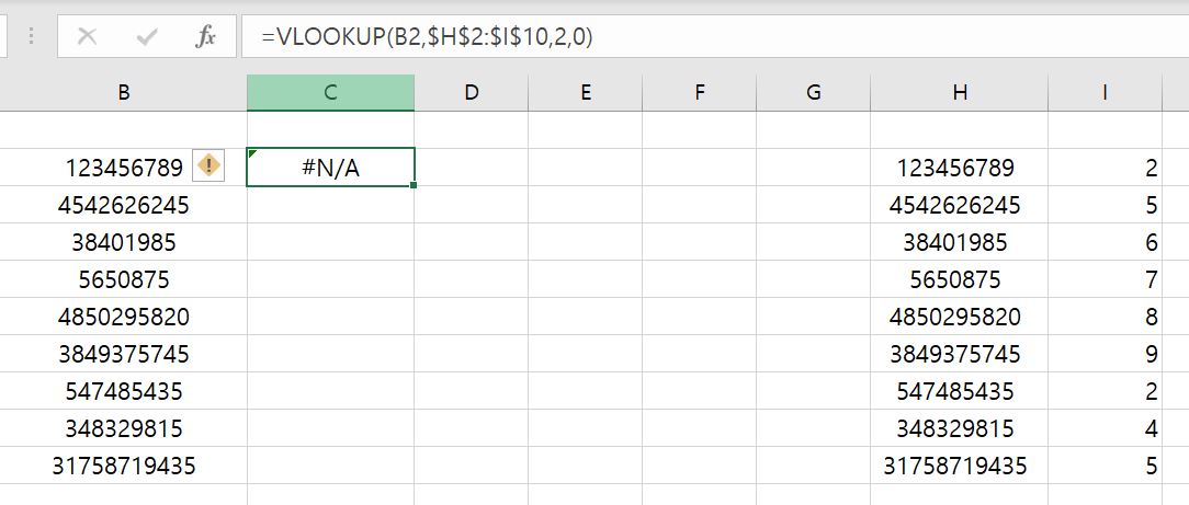 분명 좌측의 123456789 와 일치하므로 커서가 있는 셀에 2의 값을 불러와야 하지만,