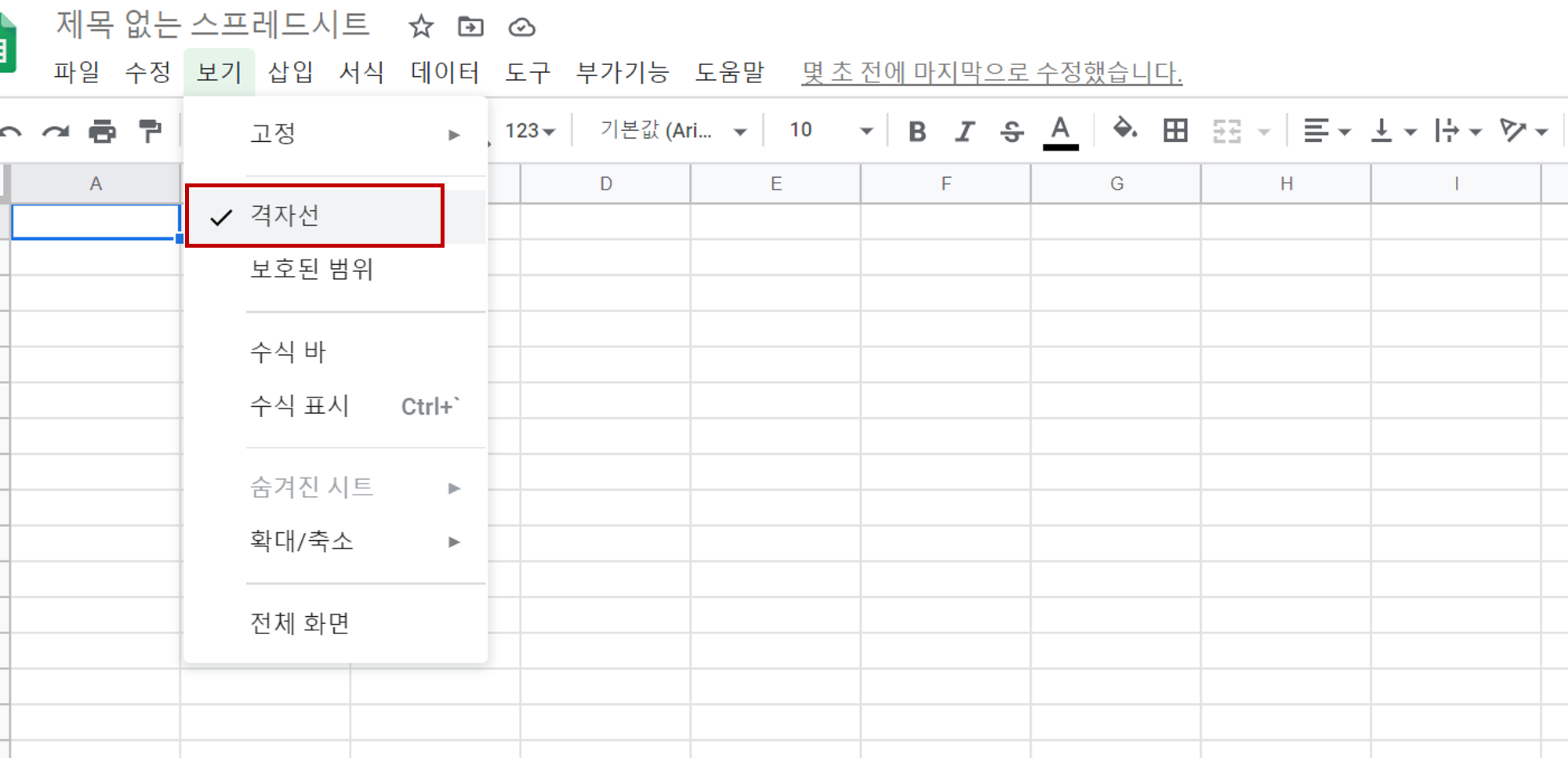보기 메뉴를 클릭하면, "눈금선"에 체크가 되어 있을 것이다